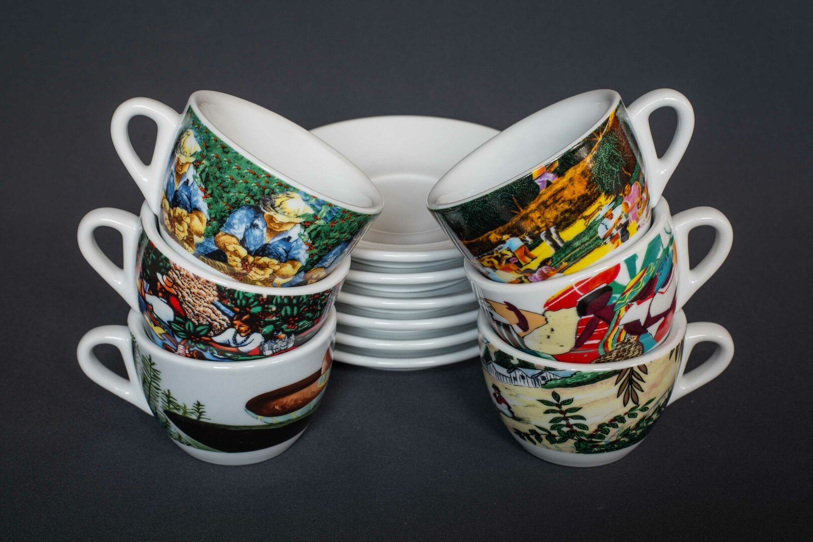 Dickwandige Tassen und Untertassen der ROSA ORIGINI-Serie in einer Serie von sechs gemalten Zeichnungen in leuchtenden Farben, die thematisch die Geschichte der Kaffeeverarbeitung in Ländern mit wachsender Tradition darstellen.