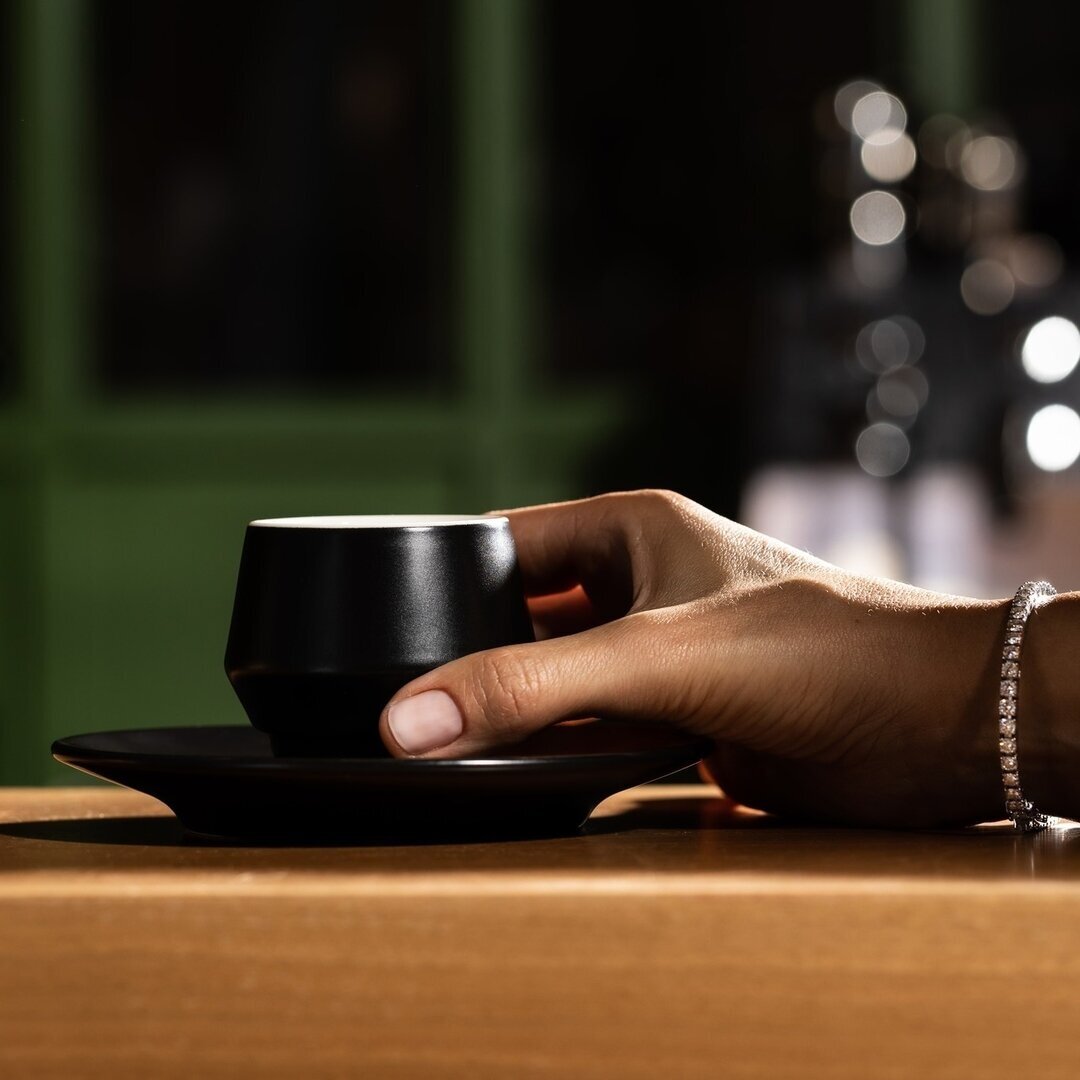 Porcelánová cappuccino šálka bez ušká s tanierikom radu MANIKO v čiernom matnom prevedení (3 modely: espresso, cappuccino, latte). Šálky s podšálkami MANIKO je možné doplniť napríklad kanvicami a mliekovkami z radu ROSA.